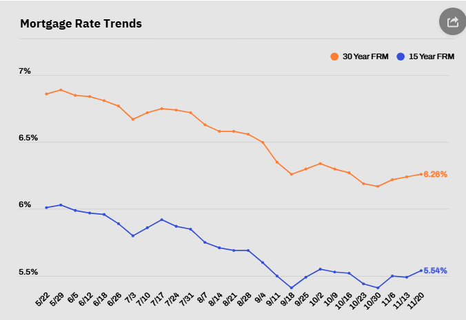 It depends on the comparison. Mortgage rates are down from a year ago, but up from a few weeks ago. It's unclear whether they'll be headed down again.